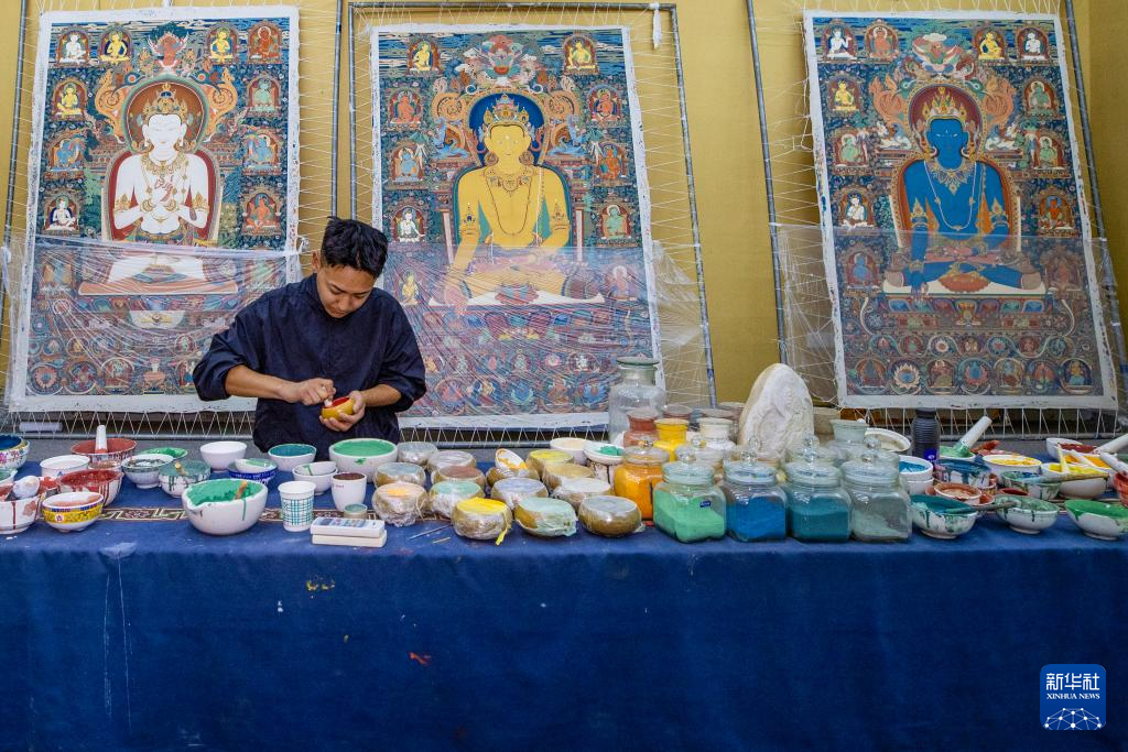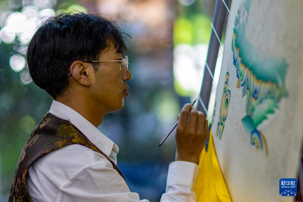 8月6日,一名畫師在繪制唐卡。藏族唐卡入選國家級非物質文化遺產代表性項目名錄。新華社記者 姜帆 攝
