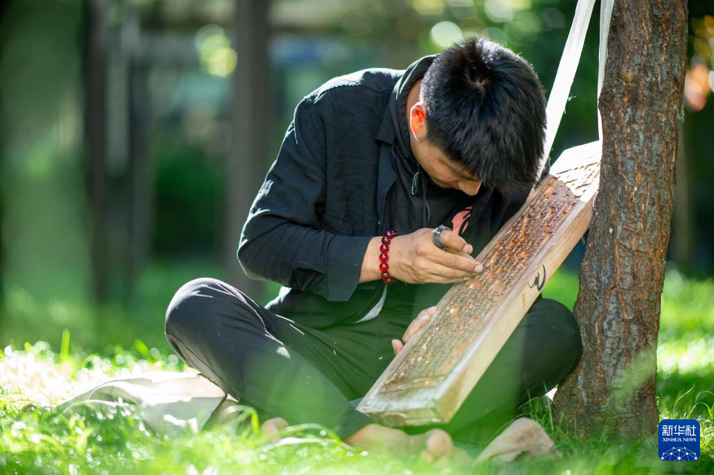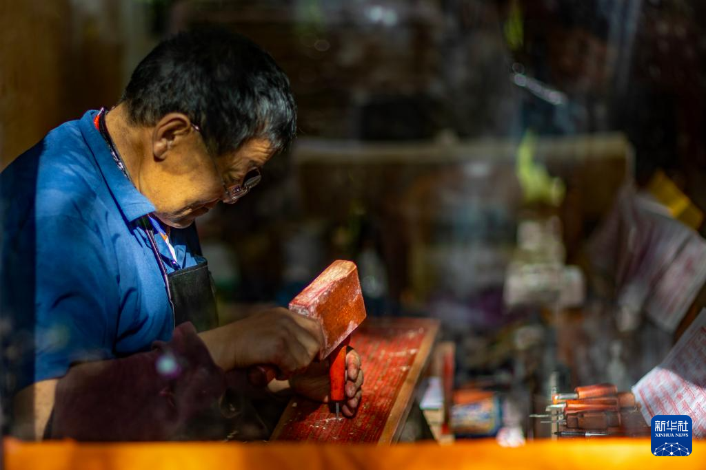 ?8月6日,一名雕刻師在雕刻中。西藏雪巴康雕版印刷制作技藝入選西藏自治區(qū)級非物質文化遺產代表性項目名錄。新華社記者 旦增尼瑪曲珠 攝 ??