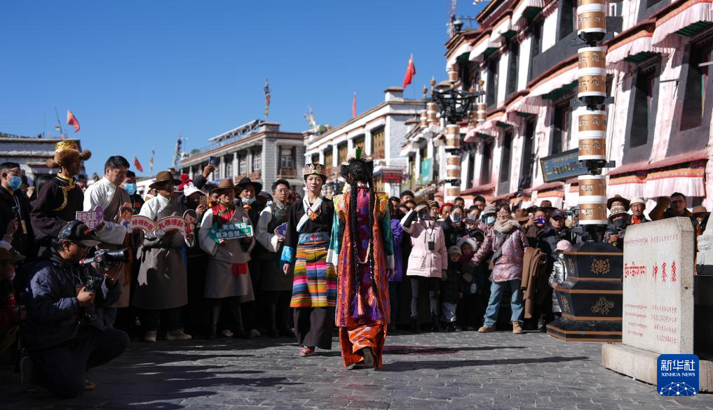 模特在拉薩八廓街“繁飾自然·衣彩拉薩——拉薩新年服飾秀”活動中巡游(1月3日攝)。新華社記者 晉美多吉 攝