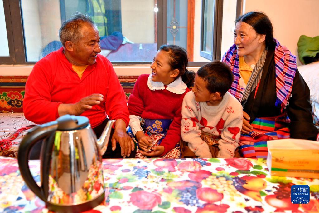 從雙湖縣多瑪鄉(xiāng)搬遷到森布日安置點(diǎn)新居的牧民索朗措加(左一)和妻子查格(右一),與孫女旦珍卓嘎(左二)和孫子歸桑桑旦一起聊天(7月19日攝)。新華社記者 張汝鋒 攝