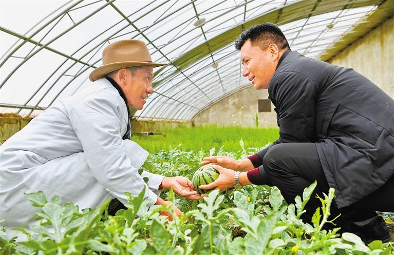 圖為措勤縣農(nóng)牧業(yè)技術(shù)推廣站站長(zhǎng)吾金次仁(右)和措勤縣高原生態(tài)畜牧業(yè)現(xiàn)代化養(yǎng)殖一體化產(chǎn)業(yè)綜合基地合作社負(fù)責(zé)人扎西桑布在西瓜大棚里交流。 新華社記者 張汝鋒 攝