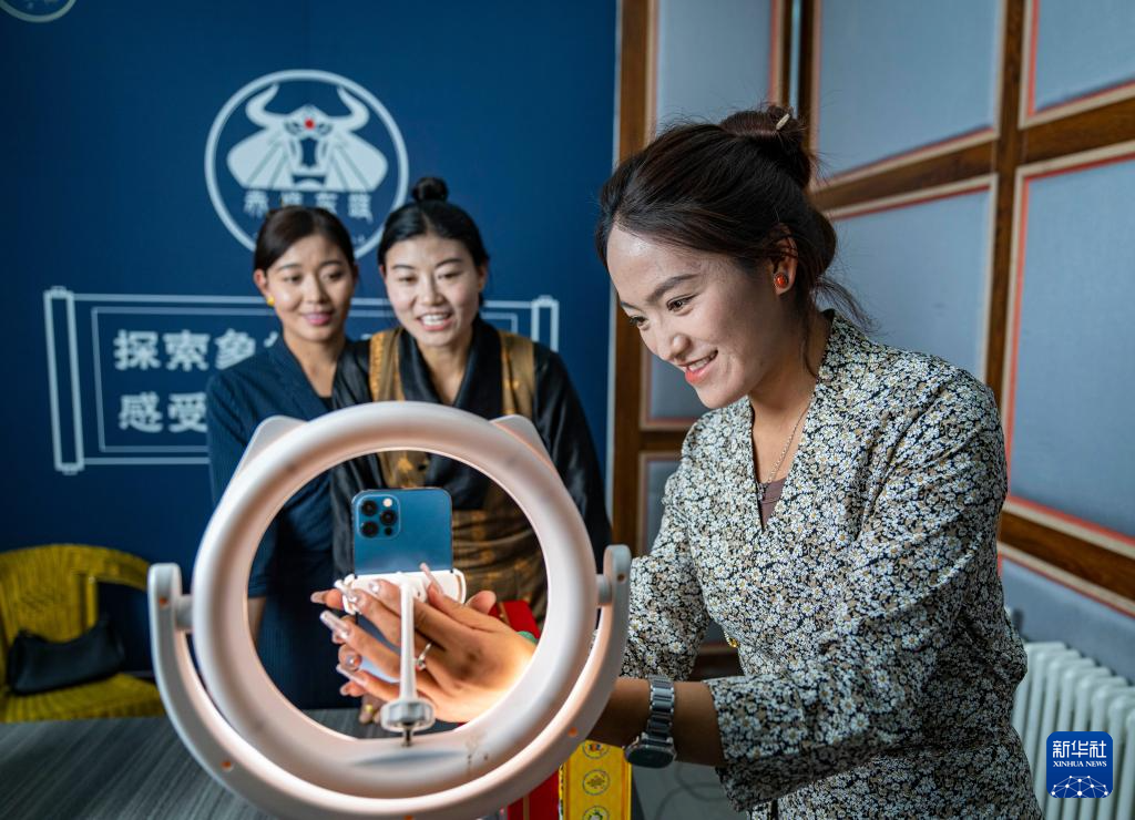 網(wǎng)絡(luò)主播在巴青縣“赤堆東雄”網(wǎng)紅直播間推介當(dāng)?shù)靥厣r(nóng)牧產(chǎn)品(10月29日攝)。新華社記者 孫非 攝