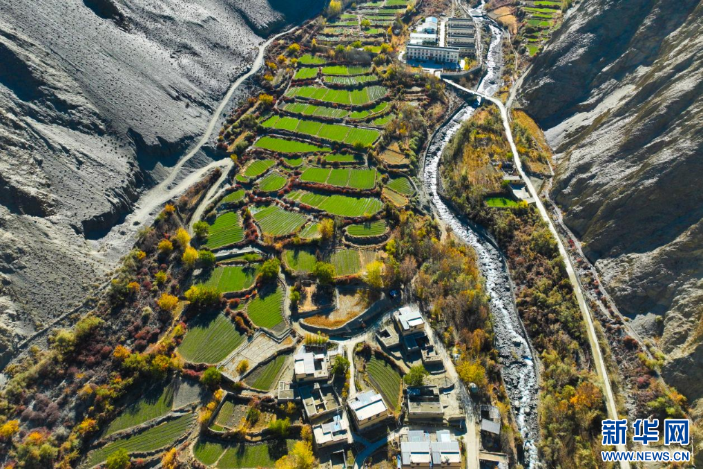 11月16日,西藏隆子縣加玉鄉(xiāng)境內(nèi)拍攝的村莊與農(nóng)田(無(wú)人機(jī)照片)。新華網(wǎng) 柑丹鴦琦 攝