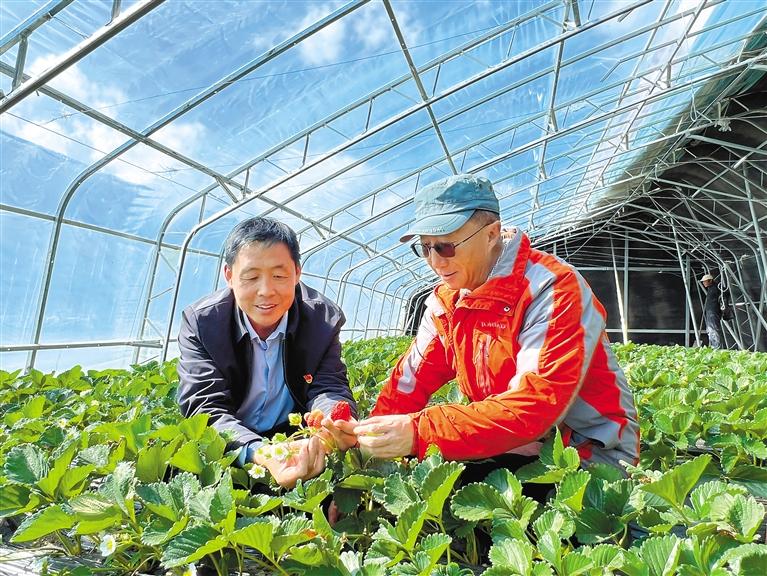 圖為基地蔬菜種植技術(shù)人員孟德利(左)與駐村干部一起查看草莓長(zhǎng)勢(shì)。記者 汪純 攝