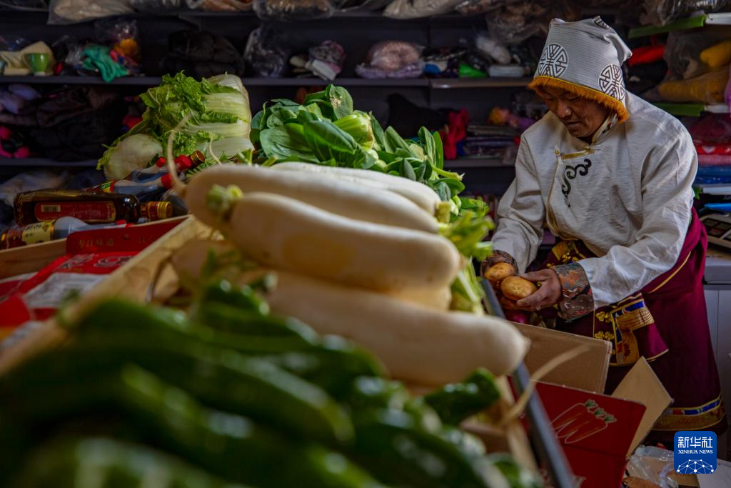 申扎縣馬躍鄉(xiāng)貝嘎四村偏遠(yuǎn)鄉(xiāng)鎮(zhèn)果蔬配送試點(diǎn)項(xiàng)目直銷點(diǎn),店主西熱加措在整理供銷合作社配送來的新鮮蔬菜(1月5日攝)。新華社記者 姜帆 攝