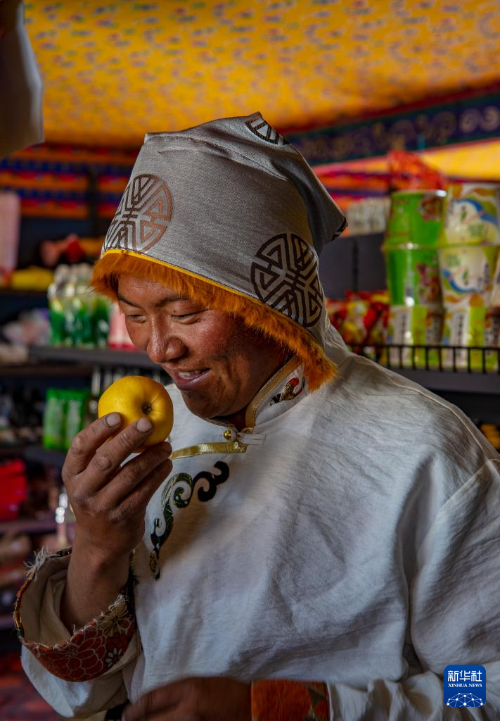 申扎縣馬躍鄉(xiāng)貝嘎四村偏遠(yuǎn)鄉(xiāng)鎮(zhèn)果蔬配送試點(diǎn)項(xiàng)目直銷點(diǎn)店主西熱加措拿起供銷合作社配送來的水果(1月5日攝)。新華社記者 姜帆 攝