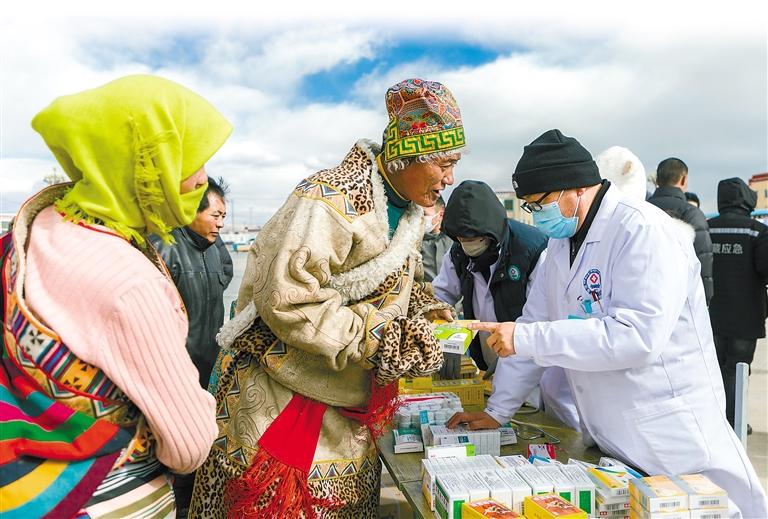 圖為“七送”活動(dòng)現(xiàn)場(chǎng),措勤縣人民醫(yī)院醫(yī)生為群眾送醫(yī)送藥。 措勤縣委宣傳部供圖