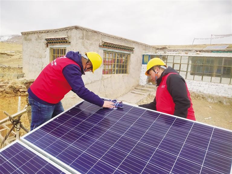 “次桑在家嗎?我們過來看一下你們新年準(zhǔn)備得怎么樣了?”聽到劉光輝的呼喚,孩子們都跑出來迎接這位“小黃帽”叔叔。劉光輝和羅桑歐珠進(jìn)屋放下年貨,顧不上休息,立馬搭梯子爬上次桑家的房頂,用抹布拂去光伏電板上的塵土,拿出工具仔細(xì)檢查電源和光伏設(shè)備是否有損壞?!按紊<矣玫氖俏覀兊牡谝淮柲芄夥姲?,這個(gè)電板要經(jīng)常擦拭,保持表面干凈,發(fā)電效率會更好?!眲⒐廨x說。檢修完光伏電板后,劉光輝和羅桑歐珠又回到屋內(nèi)檢查次桑家的電路線路,對插排插座等可能存在安全隱患的地方進(jìn)行認(rèn)真排查。確保沒有問題后,兩人將之前昏暗的燈泡全部換成了最新的節(jié)能燈泡,整個(gè)屋子一下亮堂了起來。