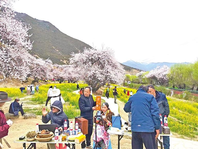 游客在“次仁的家藏式體驗館”區(qū)域拍照打卡集章。林芝市職業(yè)技術(shù)學(xué)校學(xué)生在嘎拉村直播,宣傳推介桃花旅游文化節(jié)、工布民俗風情及農(nóng)特產(chǎn)品等。[詳細] -