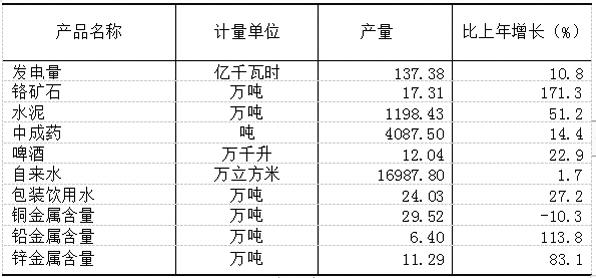 全年規(guī)模以上工業(yè)企業(yè)水泥產(chǎn)量1198.43萬噸,比上年增長51.2%;鉻礦石17.31萬噸,增長171.3%;中成藥(藏醫(yī)藥)4087.50噸,增長14.4%;自來水16987.80萬立方米,增長1.7%;發(fā)電量137.38億千瓦時,增長10.8%;啤酒12.04萬千升,增長22.9%;包裝飲用水24.03萬噸,增長27.2%。