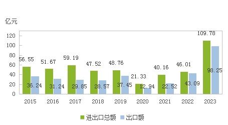 全年貨物貿(mào)易進出口總額109.78億元,比上年增長138.3%。其中,出口98.25億元,增長127.7%;進口11.53億元,增長295.2%。一般貿(mào)易進出口82.29億元,增長166.5%。其中,出口72.23億元,增長157.3%;進口10.06億元,增長258.4%。邊境小額貿(mào)易進出口26.70億元,增長78.6%。其中,出口25.88億元,增長73.2%;進口0.82億元,增長98.7倍。