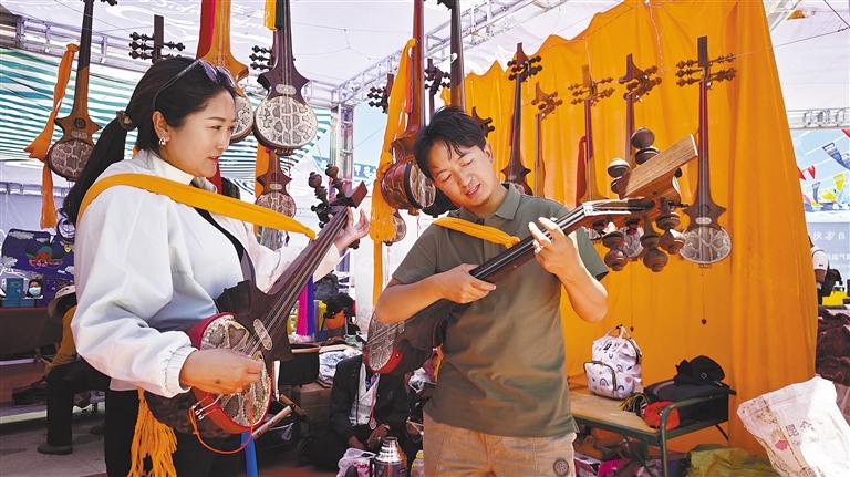 圖為在日喀則高原農(nóng)特產(chǎn)品及尼泊爾特色產(chǎn)品展示展銷活動(dòng)上,商家向顧客介紹扎念琴。