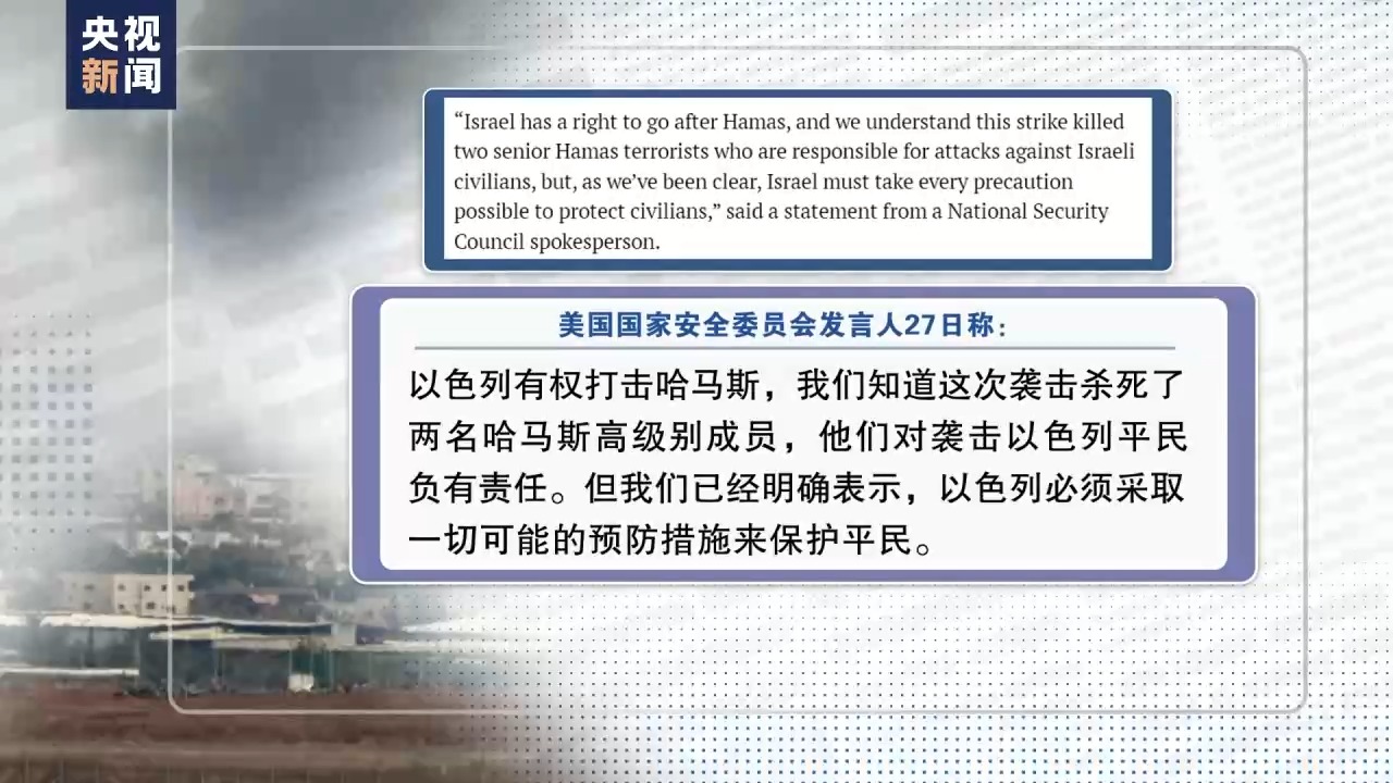 美國國家安全委員會發(fā)言人27日稱:以色列有權(quán)打擊哈馬斯,我們知道這次襲擊殺死了兩名哈馬斯高級別成員,他們對襲擊以色列平民負有責(zé)任。但我們已經(jīng)明確表示,以色列必須采取一切可能的預(yù)防措施來保護平民。