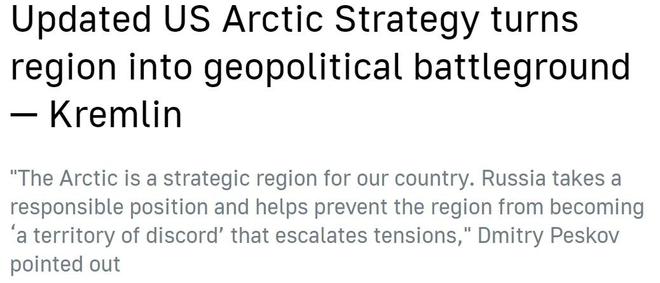 在被問及對美國這份北極戰(zhàn)略報告的看法時,俄羅斯總統(tǒng)新聞秘書佩斯科夫指出,美方報告顯示出對抗色彩,而俄羅斯一直在北極問題上采取負責(zé)任的立場,"為確保北極不會成為紛爭和局勢緊張地區(qū)做出貢獻"。