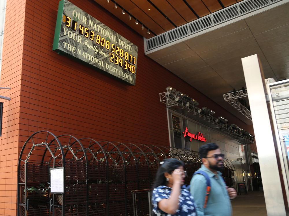 2023年5月29日,人們經(jīng)過美國紐約曼哈頓的“國債鐘”。“國債鐘”是一個(gè)大型計(jì)數(shù)器,它實(shí)時(shí)更新美國的公共債務(wù)總額,并顯示出每個(gè)美國家庭所要負(fù)擔(dān)的數(shù)額。新華社記者劉亞南攝