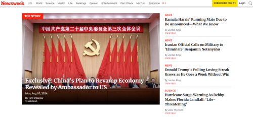 2024年8月2日,駐美國(guó)大使謝鋒接受美國(guó)《新聞周刊》(Newsweek)高級(jí)外交政策記者湯姆·奧康納專訪,闡釋中國(guó)共產(chǎn)黨二十屆三中全會(huì)精神。訪談內(nèi)容8月5日在該周刊網(wǎng)站頭版頭條刊登。主要內(nèi)容如下: