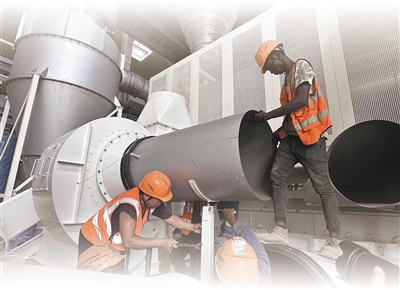 在科特迪瓦阿比讓可可加工廠內(nèi),中科工作人員正在安裝調(diào)試設(shè)備。科特迪瓦阿比讓網(wǎng)記者 希普林·夸西攝