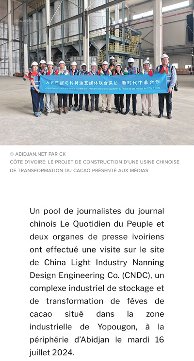 7月16日,人民日報與兩家科特迪瓦新聞機構(gòu)記者一行參觀了由中國輕工業(yè)南寧設(shè)計工程有限公司總承包的可可加工及可可豆倉庫建設(shè)項目,該項目坐落在阿比讓郊區(qū)的約普貢工業(yè)區(qū)。