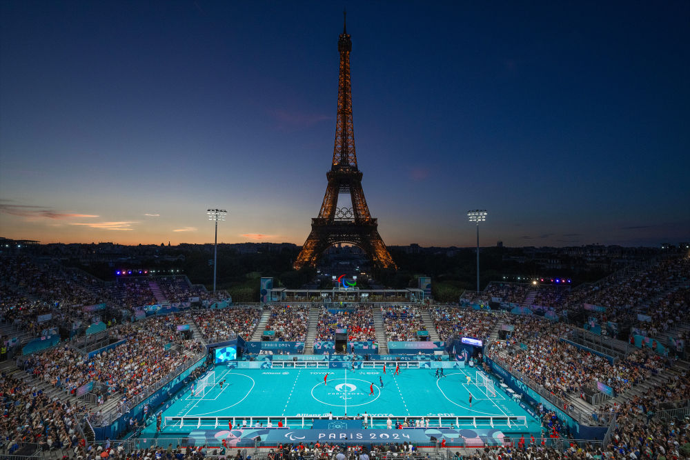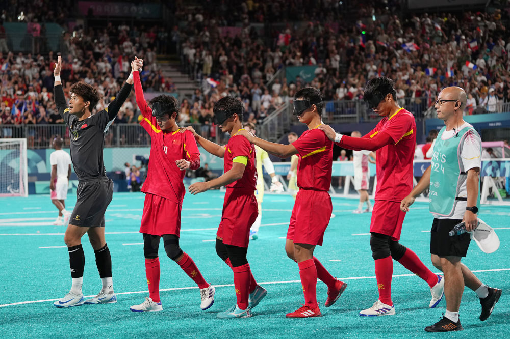 這是9月1日拍攝的巴黎殘奧會盲人足球比賽現(xiàn)場。新華社記者 熊琦 攝