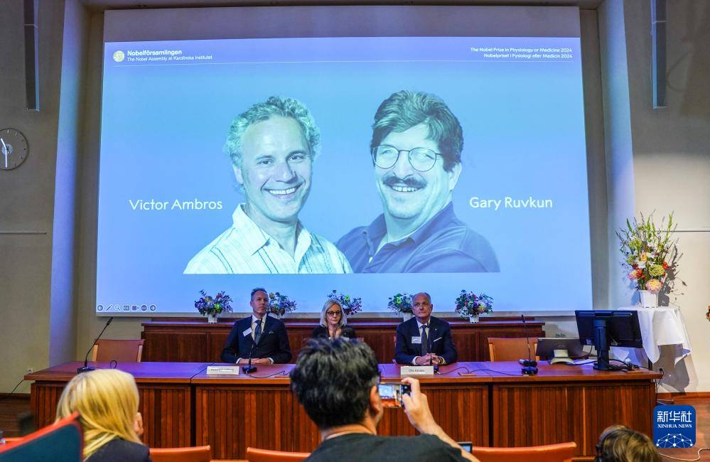 10月7日,在瑞典斯德哥爾摩舉行的2024年諾貝爾生理學或醫(yī)學獎公布現(xiàn)場,屏幕顯示獎項得主美國科學家維克托·安布羅斯(左)和加里·魯夫坎的照片。新華社記者 彭子洋 攝