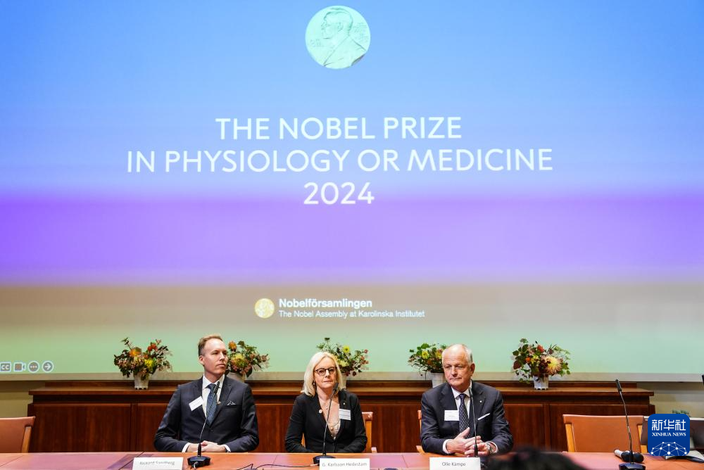這是10月7日在瑞典斯德哥爾摩拍攝的2024年諾貝爾生理學或醫(yī)學獎公布現(xiàn)場。新華社記者 彭子洋 攝
