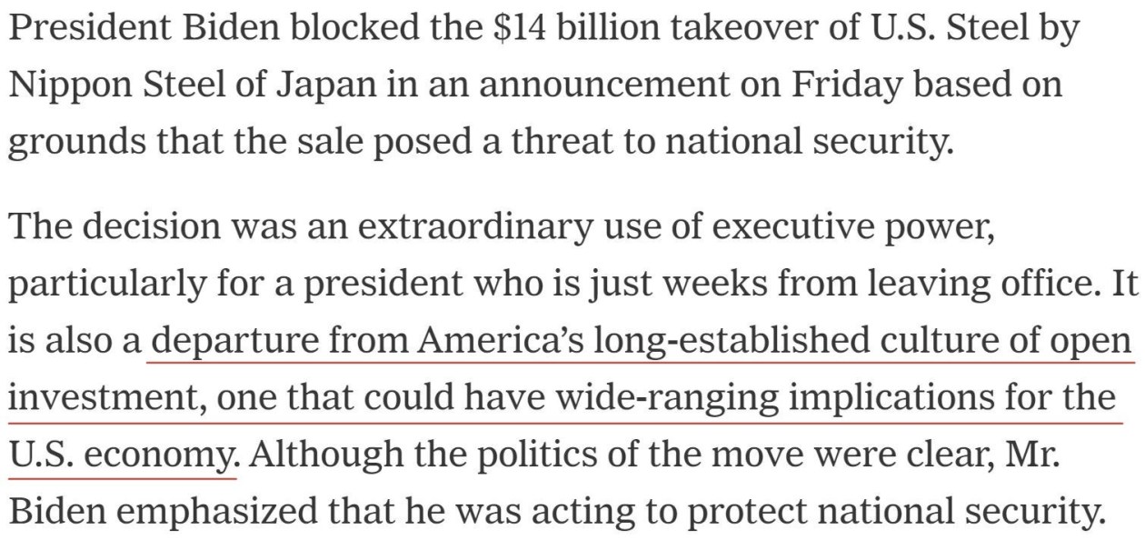 雖然日鐵多次讓步,但美國總統(tǒng)拜登當?shù)貢r間3日發(fā)表聲明,正式阻止了這筆價值2萬億日元(按目前匯率約合127億美元)的交易。