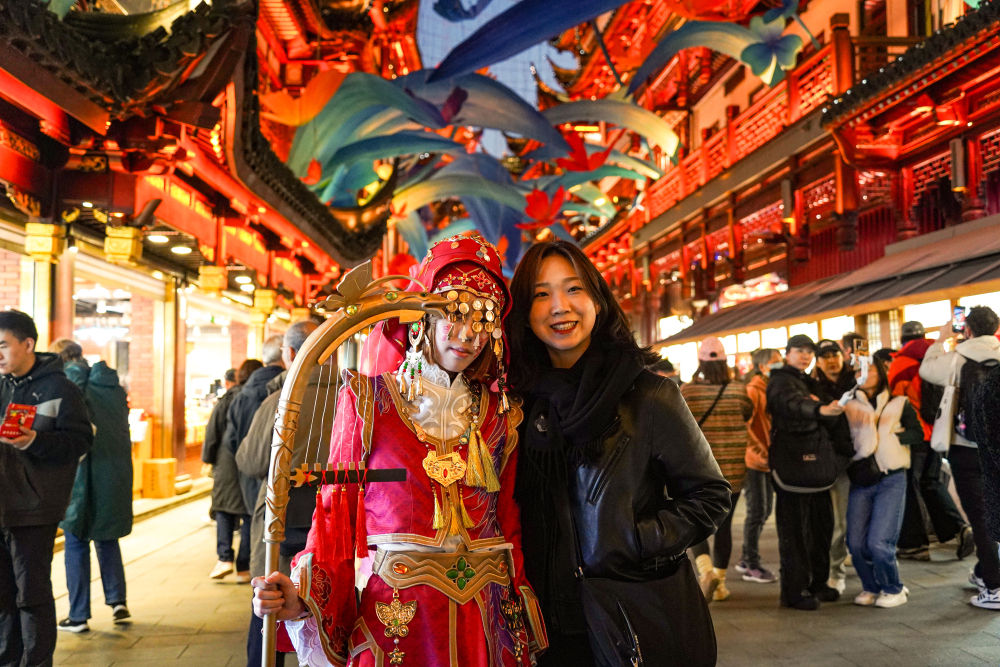 2024年11月30日,來自韓國的游客(右)在上海豫園商城與游戲角色裝扮者合影。新華社發(fā)(謝鑫 攝)