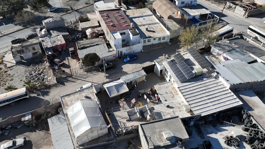 這是2025年2月2日在墨西哥奇瓦瓦州華雷斯城拍攝的一處移民收容所(無(wú)人機(jī)照片)。新華社記者 李夢(mèng)馨 攝