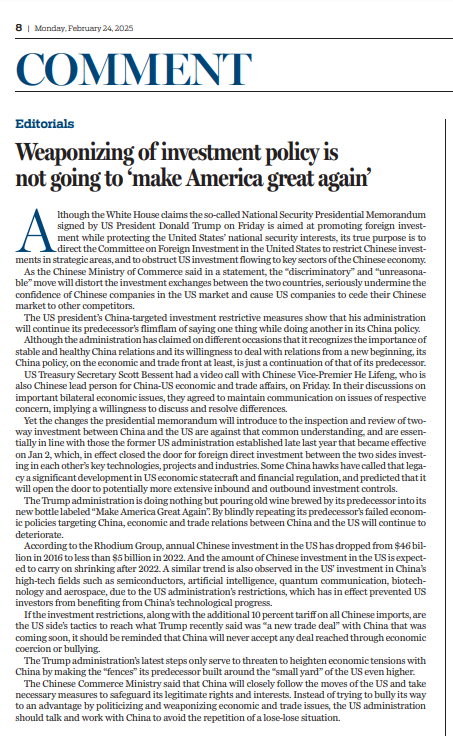 上周五(2月21日),美國總統(tǒng)特朗普簽署所謂的“國家安全總統(tǒng)備忘錄”(下稱“備忘錄”)。白宮稱,該備忘錄旨在鼓勵(lì)外來投資的同時(shí),保護(hù)美國國家安全利益。然而,其真實(shí)目的是責(zé)令美國外國投資委員會(huì)限制中國對(duì)美國關(guān)鍵領(lǐng)域投資,并妨礙美國對(duì)中國關(guān)鍵領(lǐng)域投資。