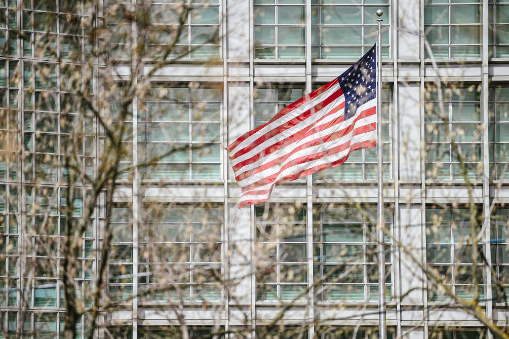 這是2021年4月16日在俄羅斯首都莫斯科拍攝的美國駐俄羅斯大使館。新華社發(fā)(葉甫蓋尼·西尼岑攝)