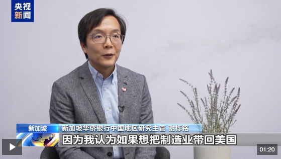 新加坡華僑銀行中國地區(qū)研究主管 謝棟銘:即使新加坡對美不存在貿(mào)易順差,也沒有對美國施加關稅,還是被征收10%的關稅。