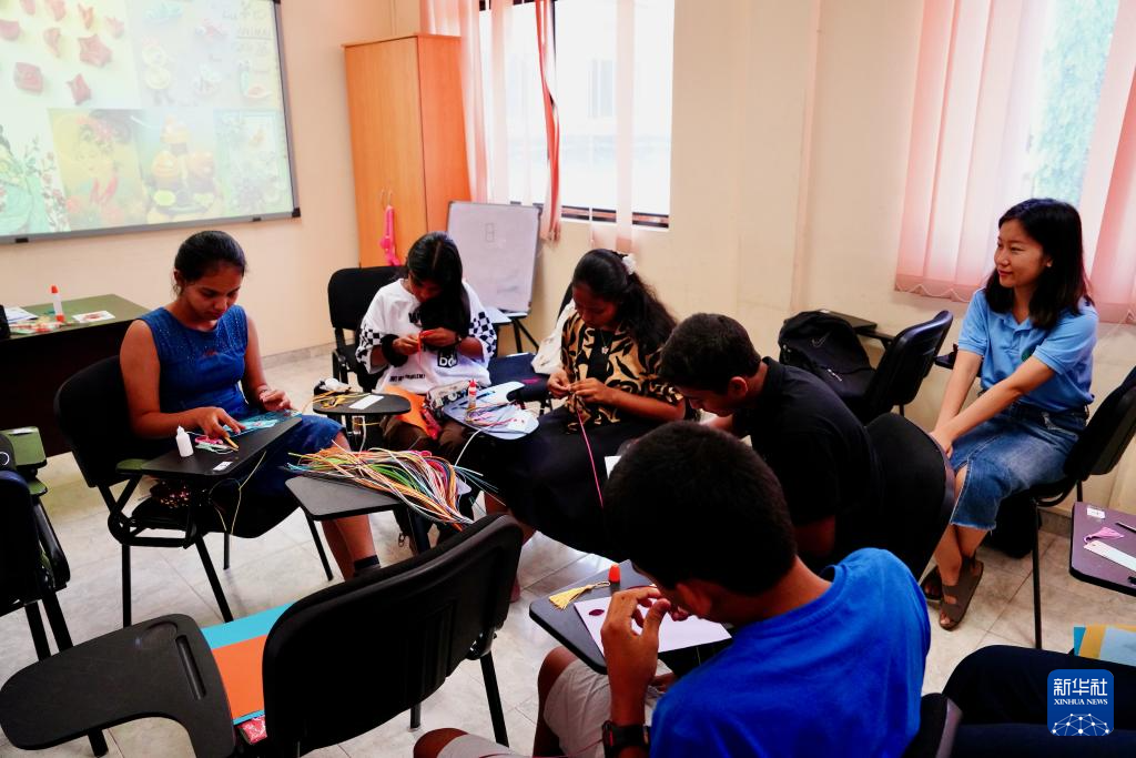 4月19日,在斯里蘭卡首都科倫坡舉行的聯(lián)合國(guó)中文日活動(dòng)上,蘭比尼孔子課堂的學(xué)生學(xué)習(xí)制作衍紙書(shū)簽。新華社記者 伍岳 攝