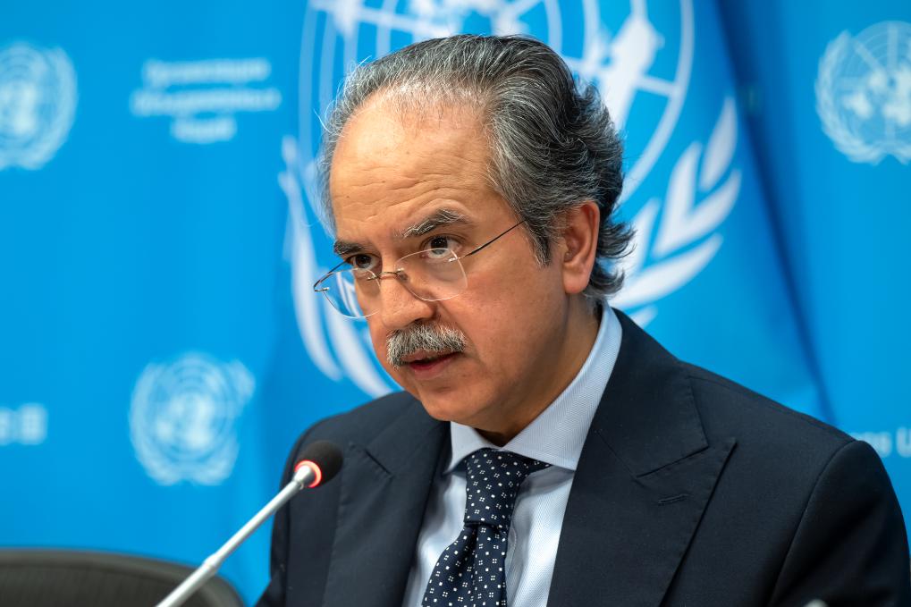 5月2日,在位于紐約的聯(lián)合國總部,巴基斯坦常駐聯(lián)合國代表阿西姆·伊夫蒂哈爾·艾哈邁德在新聞發(fā)布會上講話。新華社發(fā)(聯(lián)合國供圖/馬克·加滕攝)