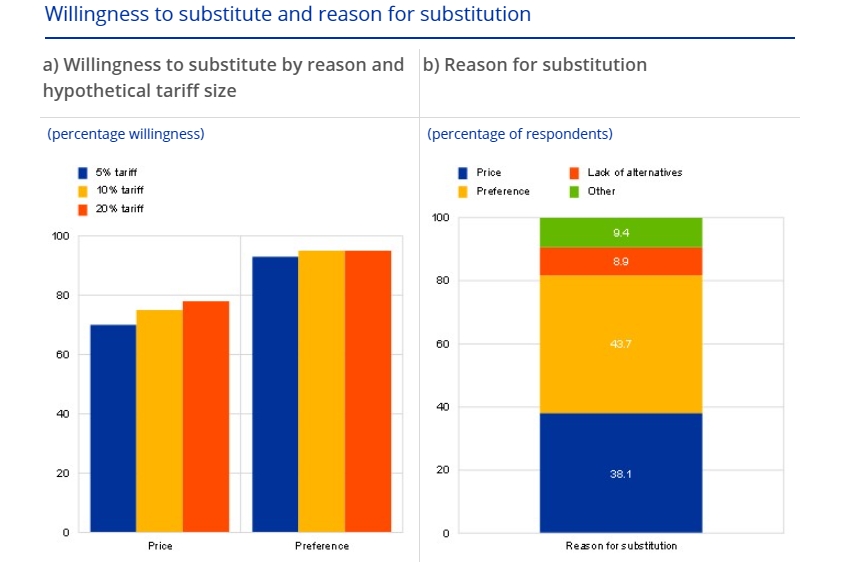 歐洲央行在4月底的博文中還提到,通常情況下,關(guān)稅對消費(fèi)者的影響程度取決于受影響產(chǎn)品和服務(wù)的需求價(jià)格彈性,即如果價(jià)格上漲,消費(fèi)者可能會轉(zhuǎn)向更便宜的替代品。然而,近期美國的關(guān)稅可能會導(dǎo)致更廣泛的偏好轉(zhuǎn)變,使歐洲人完全放棄美國產(chǎn)品和品牌,不論價(jià)格如何變化。