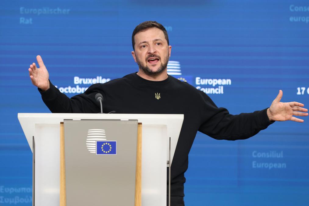 2024年10月17日,在比利時布魯塞爾,烏克蘭總統(tǒng)澤連斯基在歐盟峰會上參加新聞發(fā)布會。新華社記者趙丁喆攝