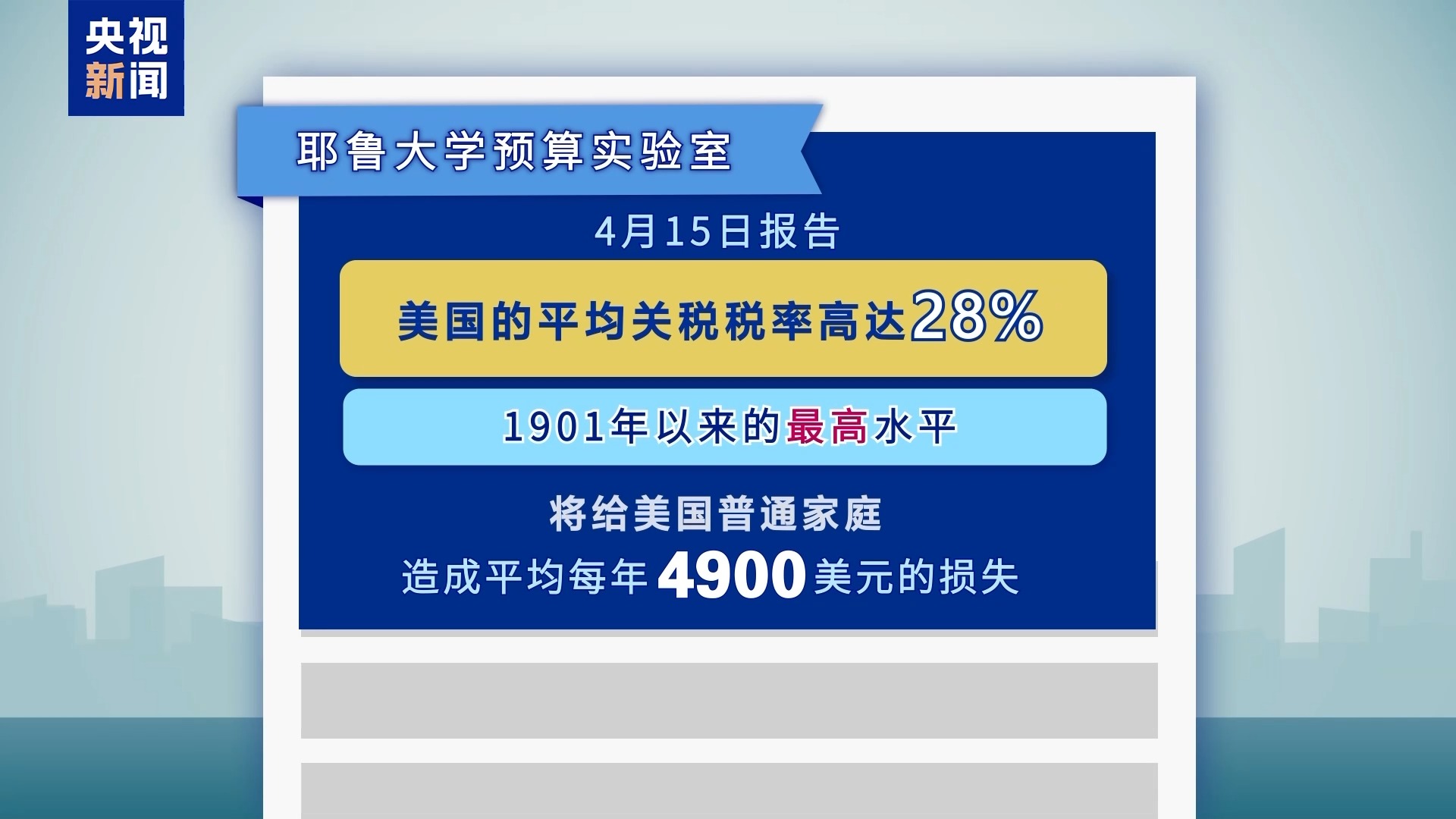 4月15日,在美國與中國、英國達(dá)成協(xié)議前,耶魯大學(xué)預(yù)算實(shí)驗(yàn)室也曾發(fā)布過一份報(bào)告。這份報(bào)告稱,美國的平均關(guān)稅稅率當(dāng)時(shí)高達(dá)28%,為1901年以來的最高水平。按照當(dāng)時(shí)的關(guān)稅稅率,將給美國普通家庭造成平均每年4900美元的損失。