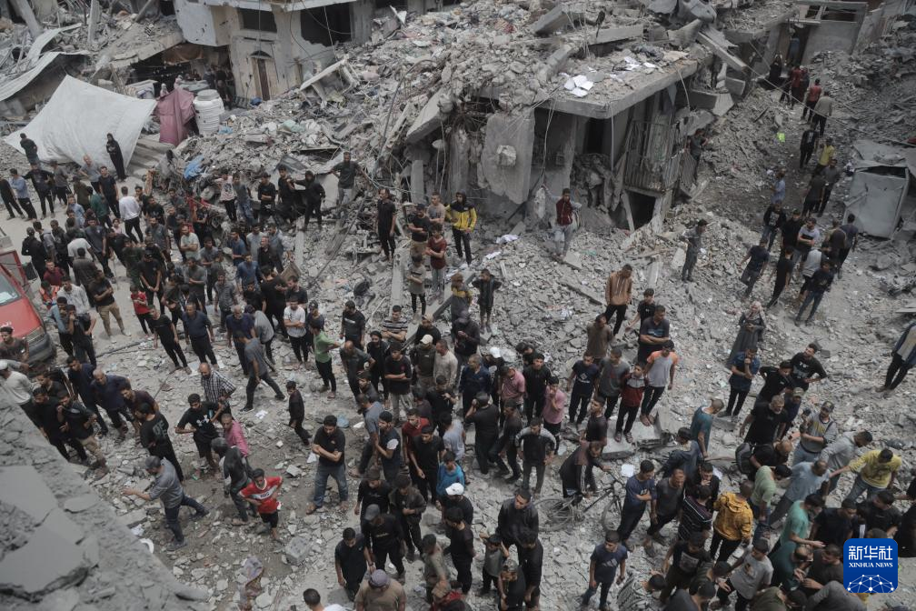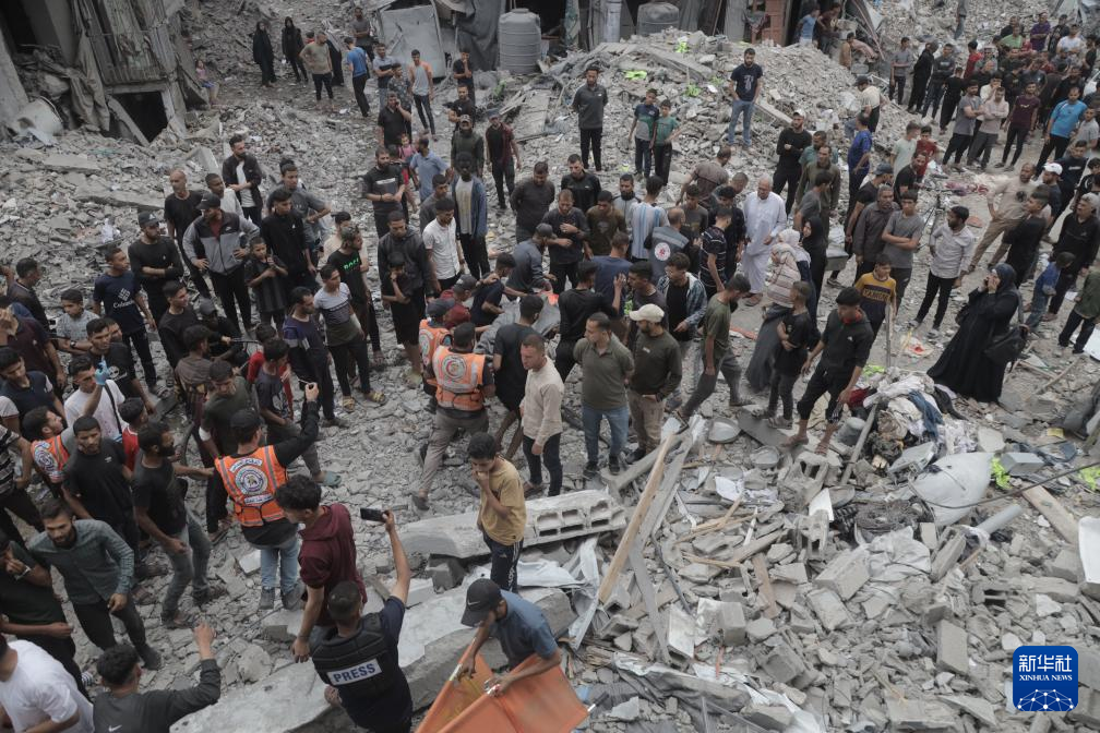 5月15日,在加沙地帶北部杰巴利耶難民營,人們?cè)谝攒娹Z炸后開展救援。新華社發(fā)(阿卜杜勒·拉赫曼·薩拉馬攝)