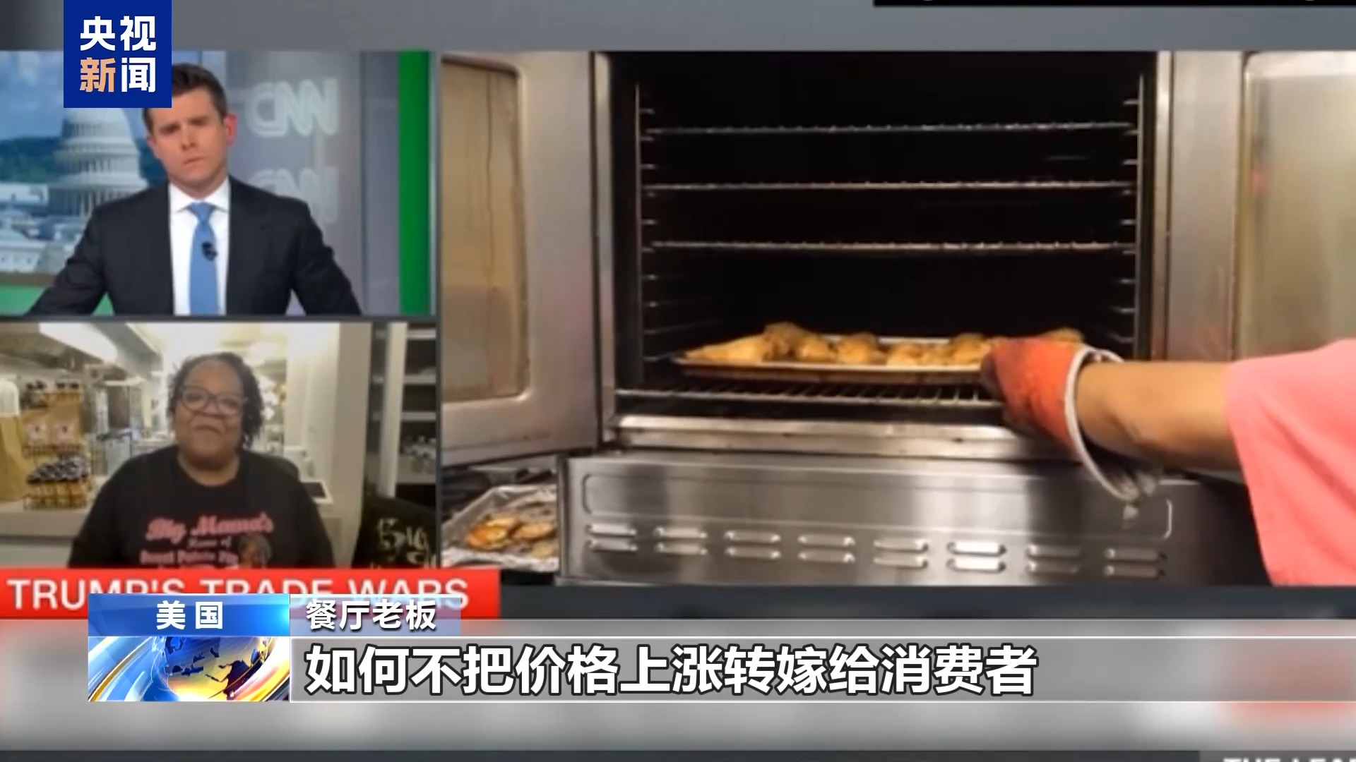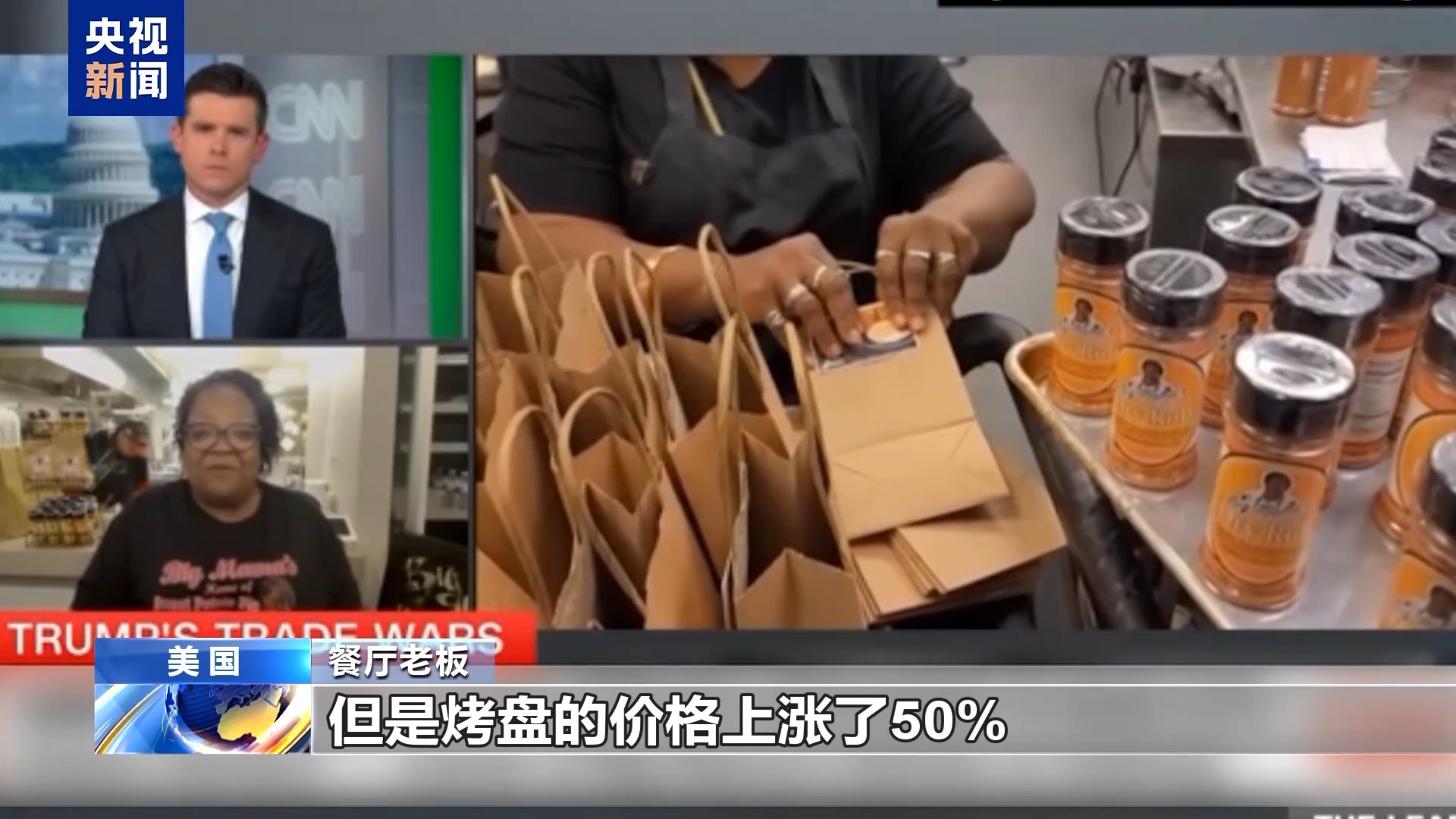 餐廳老板:我們餐廳的炸雞產(chǎn)品上過電視臺的節(jié)目,我們也在線上賣調(diào)料產(chǎn)品,這是關(guān)稅影響最大的地方。另外就是餐廳的供應(yīng),比如我們使用谷物面包,我們一般用鋁箔烤盤制作面包,但是烤盤的價格上漲了50%,所以我們現(xiàn)在換回平底鍋制作面包。