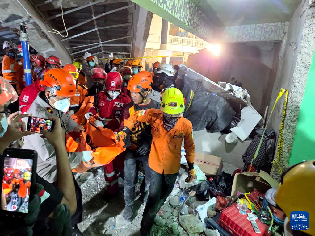 10月1日,救援人員在印度尼西亞東爪哇省詩都阿佐縣建筑倒塌現(xiàn)場救出一名幸存者。新華社發(fā)(印尼國家搜救局供圖)