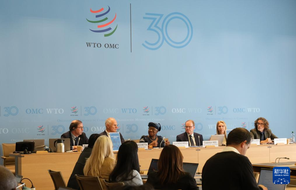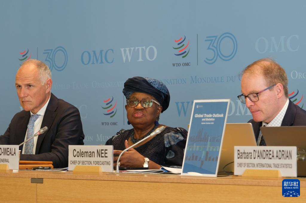 10月7日,在瑞士日內(nèi)瓦世界貿(mào)易組織總部,世貿(mào)組織總干事伊維拉(中)在新聞發(fā)布會上講話。新華社記者 馬汝軒 攝