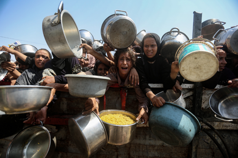 2025年8月10日,民眾在加沙城領(lǐng)取免費食物。新華社發(fā)(里澤克·阿卜杜勒賈瓦德攝)