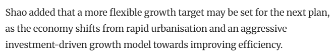 《南華早報》援引分析人士的表述認為,隨著中國經(jīng)濟從快速城鎮(zhèn)化和投資驅(qū)動型增長模式轉(zhuǎn)向高質(zhì)量發(fā)展,中國下一個五年規(guī)劃可能會設定更靈活的增長目標。