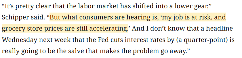 美國(guó)圣托馬斯大學(xué)副教授泰勒·施普爾 (Tyler Schipper)認(rèn)為 :對(duì)普通消費(fèi)者來說,耳邊最真切的聲音是“我的工作隨時(shí)可能保不住”,是“超市里的食品雜貨價(jià)格還在一個(gè)勁往上漲”。所以我實(shí)在不確定,下周“美聯(lián)儲(chǔ)降息”的頭條新聞,真能成為化解這些現(xiàn)實(shí)困境的良藥嗎?