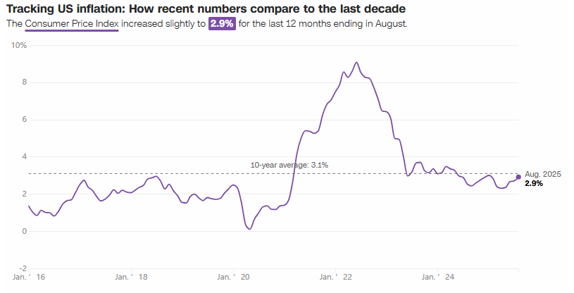 美國(guó)勞工統(tǒng)計(jì)局最新數(shù)據(jù)顯示,2025年8月消費(fèi)者價(jià)格指數(shù)(CPI)環(huán)比上漲0.4%,年通脹率攀升至2.9%,不僅創(chuàng)下今年1月以來的最高水平,而且增速超過7月的2.7%。