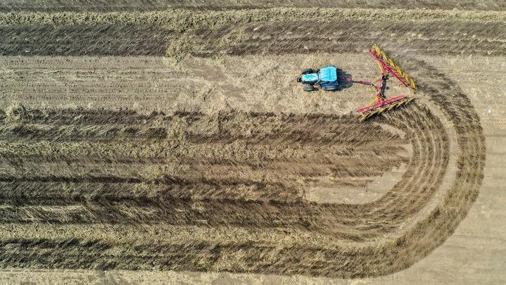 4月2日,在吉林省公主嶺市范家屯鎮(zhèn)乾程農(nóng)民專業(yè)合作社,農(nóng)民駕駛農(nóng)機(jī)整理耕地上的秸稈(無(wú)人機(jī)拍攝)。