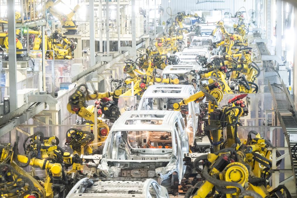 4月1日,在位于湖北武漢市經(jīng)開區(qū)的嵐圖汽車電動化焊裝車間,機(jī)器人在流水線上作業(yè)。新華社記者 肖藝九 攝