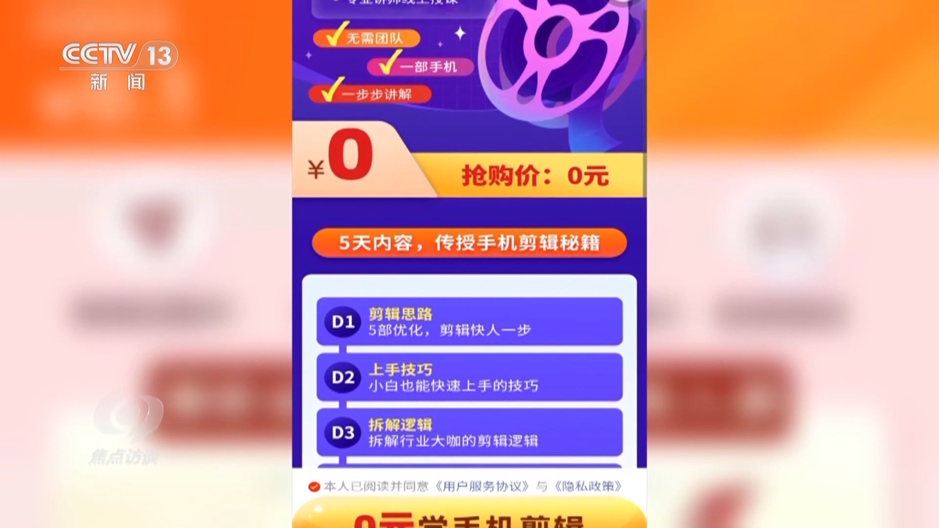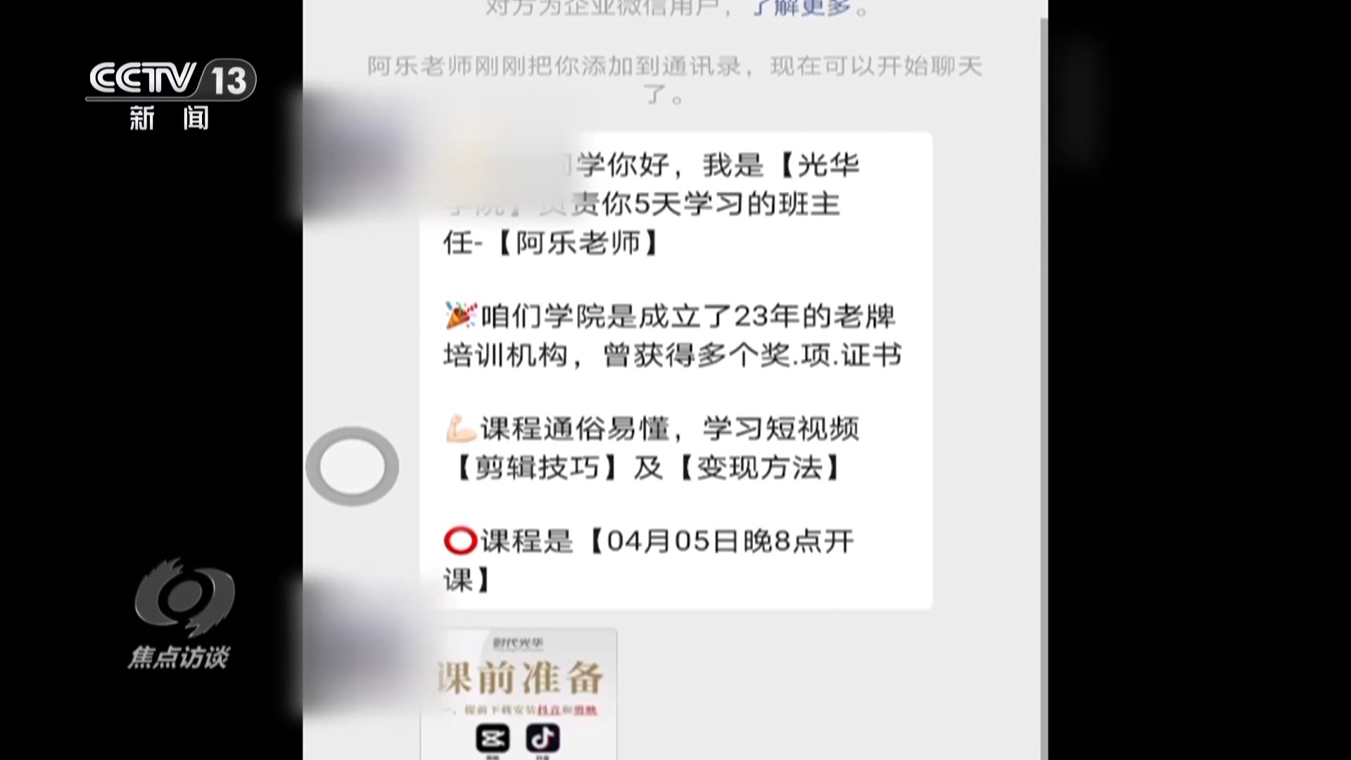 黃先生的遭遇并不是個案。記者瀏覽多個網(wǎng)絡平臺,發(fā)現(xiàn)類似的廣告比比皆是,五花八門,0元學配音、0元學書法、0元學易經(jīng)……記者隨機點開了一家賬號主體為北京時代光華科技有限公司的0元5天剪輯直播課,添加所謂的老師微信之后就被拉進了一個微信群,4月5日晚上8點,課程開始了。