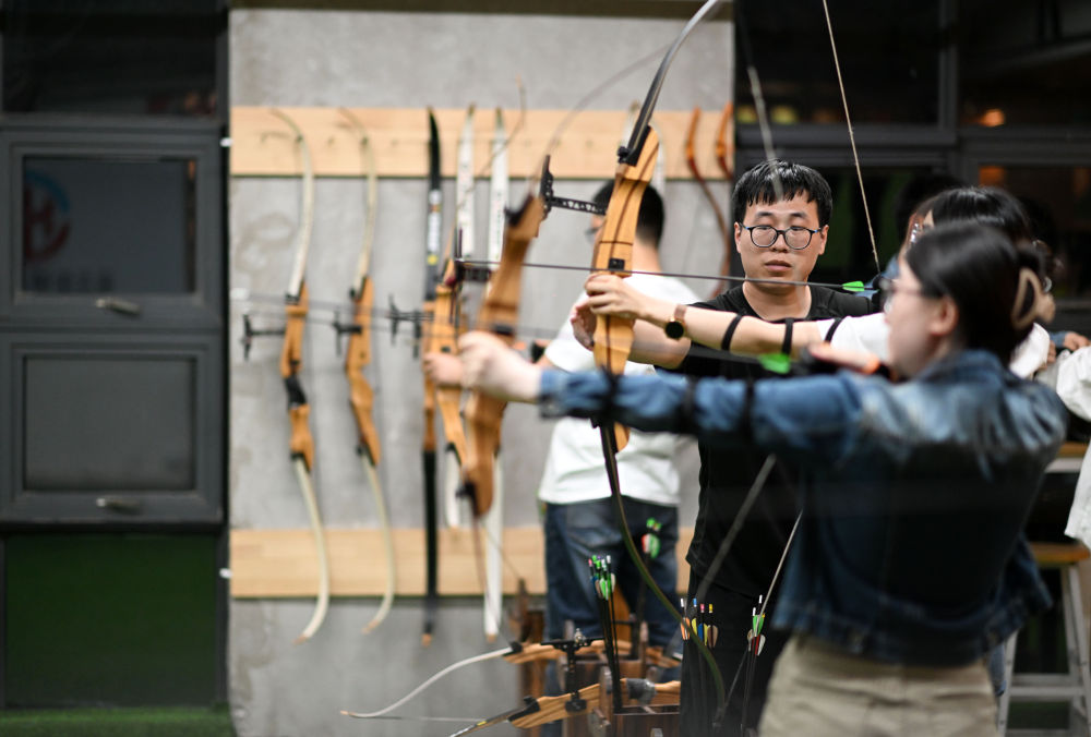 ↑4月25日,在天津市璽元銳鋒射箭俱樂部,學(xué)員在河西區(qū)青年夜校射箭課上體驗(yàn)射箭運(yùn)動。