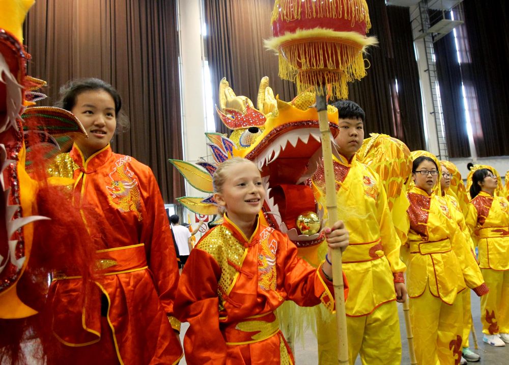 ↑2016年6月9日,上海向明初級(jí)中學(xué)的學(xué)生、法國女孩凱米(左二)在學(xué)校龍獅隊(duì)中擔(dān)任引獅人的表演任務(wù)。