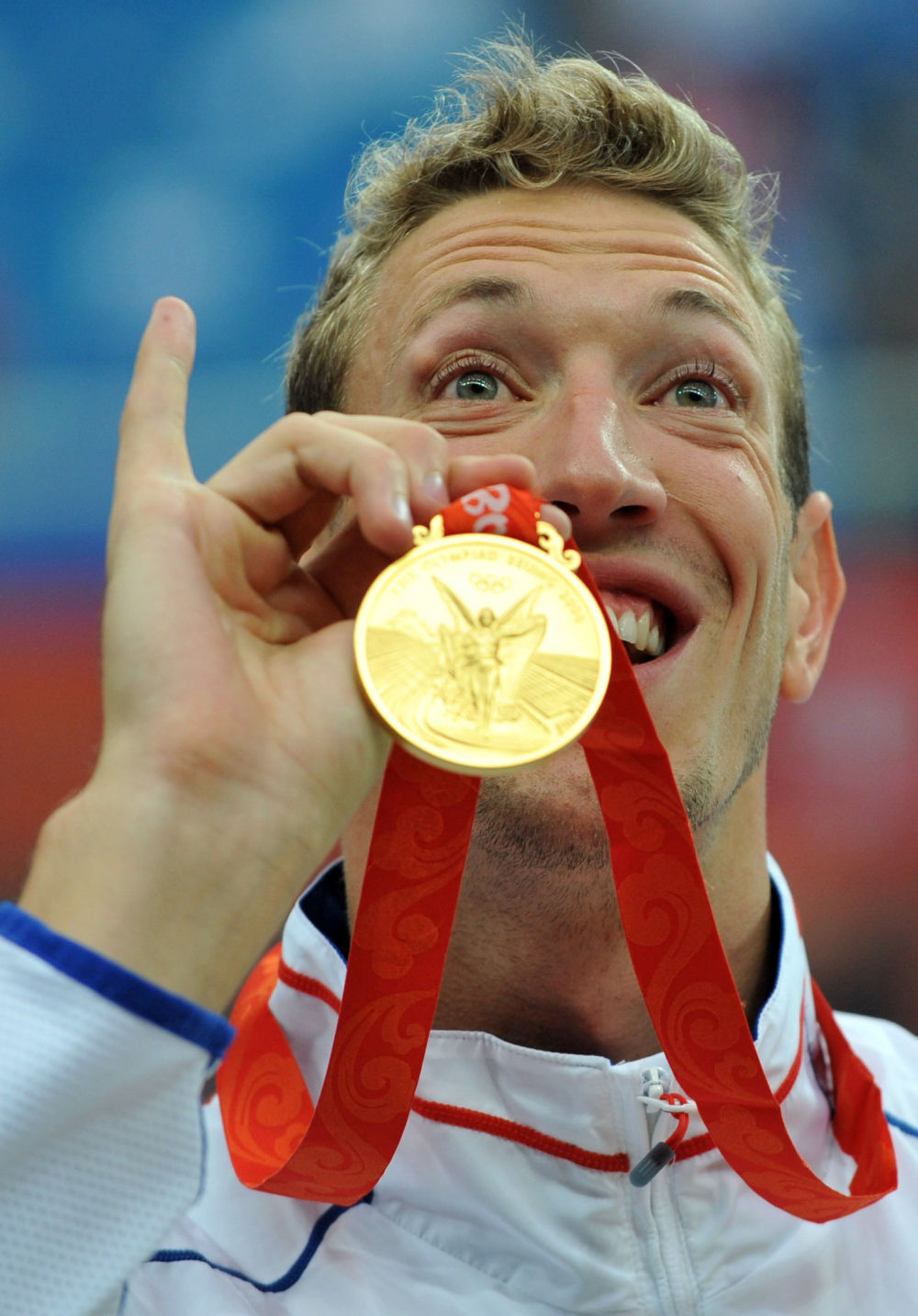 ↑2008年8月14日,法國選手阿·貝爾納在北京奧運(yùn)會(huì)男子100米自由泳頒獎(jiǎng)儀式后展示金牌。